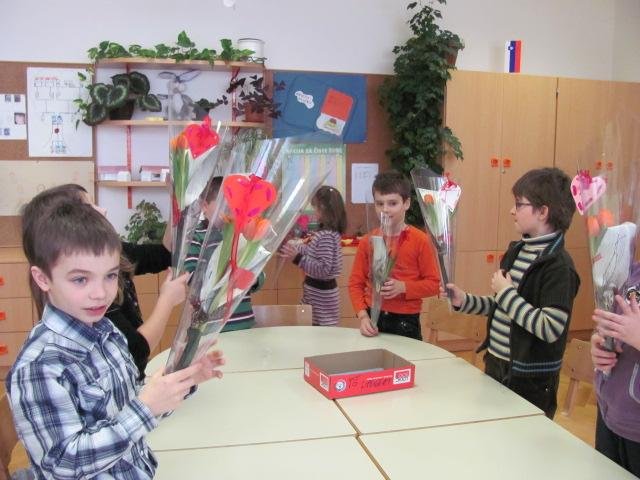 V okviru podaljšanega bivanja smo organizirali valentinovo delavnico. Gospa cvetličarka, Alena Dovžan, iz cvetličarne Gardenia Interspar Vič je našim učencem predstavila poklic cvetličarja/ke. Povedala nam je, da-le ta poleg sajenja rož opravlja še mnogo drugih stvari - zavija darila, oblikuje aranžmaje, ikebane, šopke Eno od teh stvari pa so naši učenci naredili kar sami - oblikovali so svoj valentinov šopek v katerega so dali dva tulipana, pobarvan list in še vrsto drugih dodatkov potrebnih za ličen šopek. Uporabili so prav take vrvice, okrasne papirje in dodatke kot jih uporabljajo cvetličarji pri svojem delu. Postopek oblikovanja je pokazala gospa cvetličarka, učenci pa so ji spretno sledili in nastali so prekrasni šopki, ki so jih učenci odnesli svojim najdražjim. Z opravljenim delom smo bili prav vsi zadovoljni. Gospe cvetličarki smo se lepo zahvalili, da nam je s svojo cvetličarno omogočila, da smo pobližje spoznali nov poklic in jo z veseljem povabili, da nas še kdaj obišče.