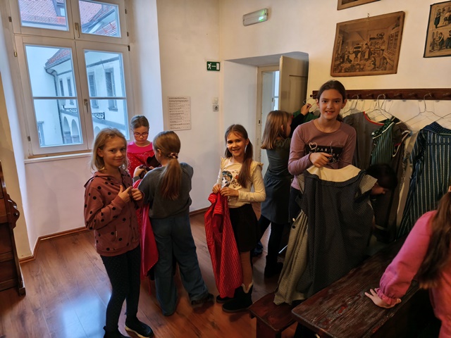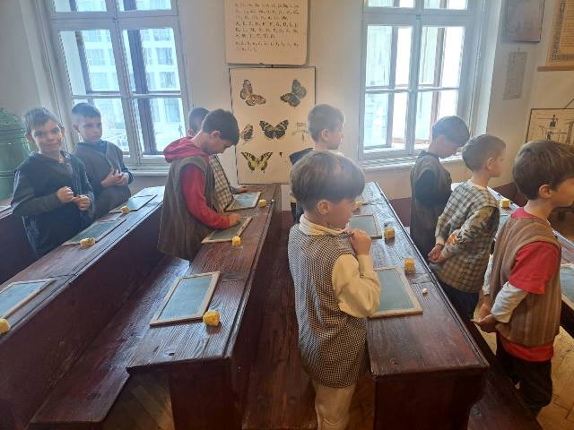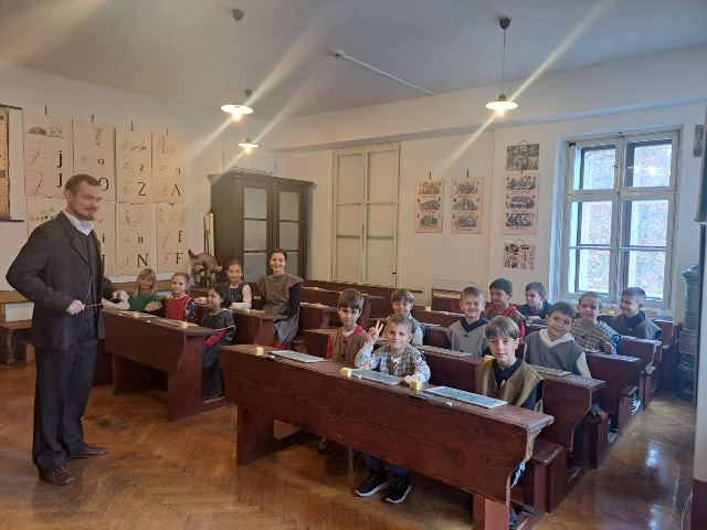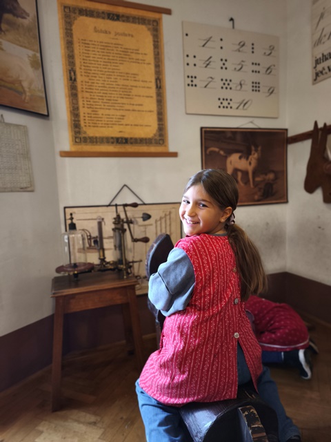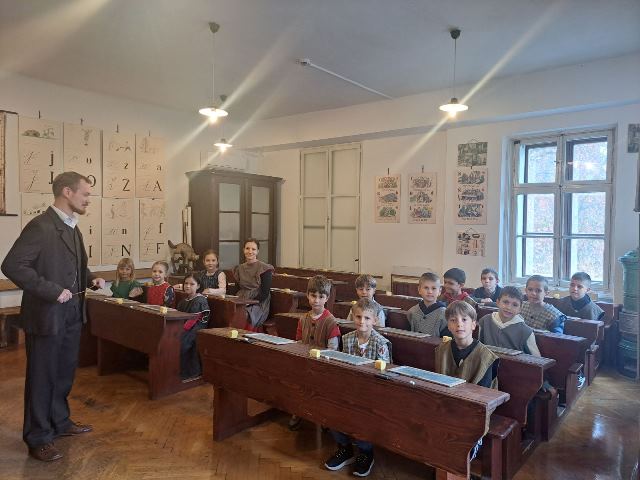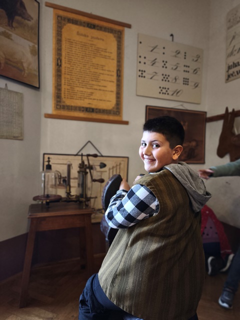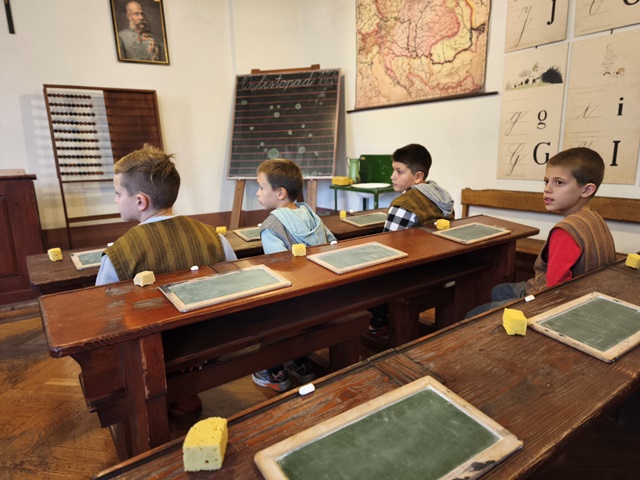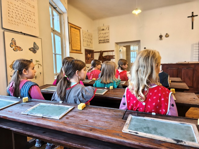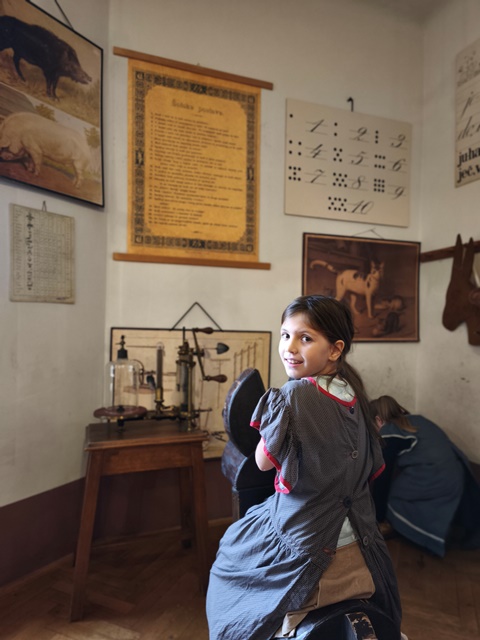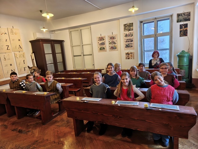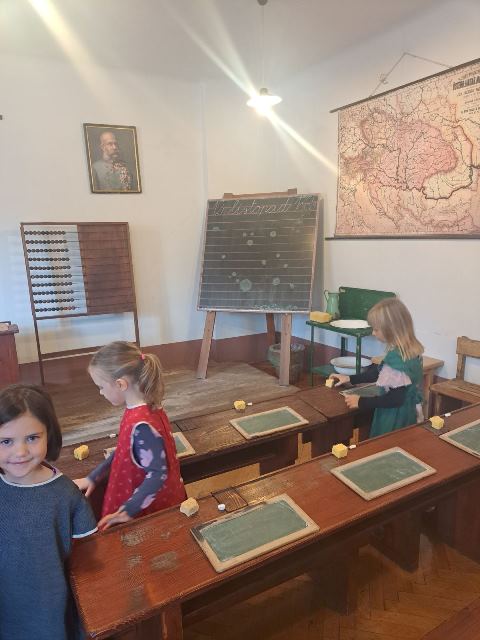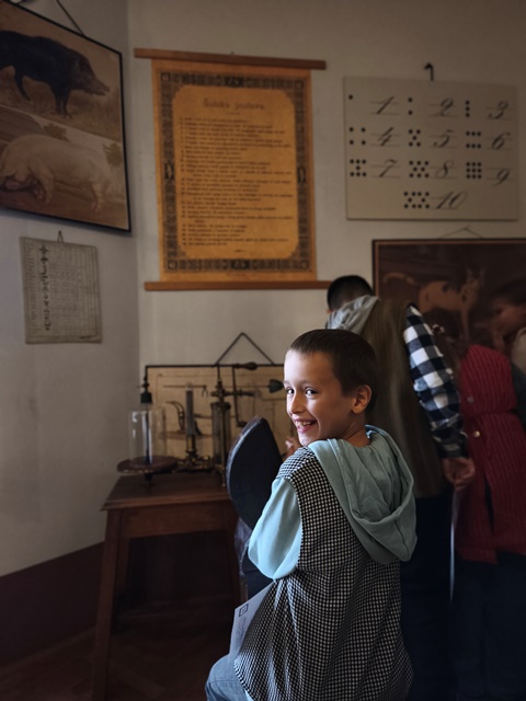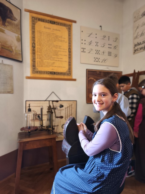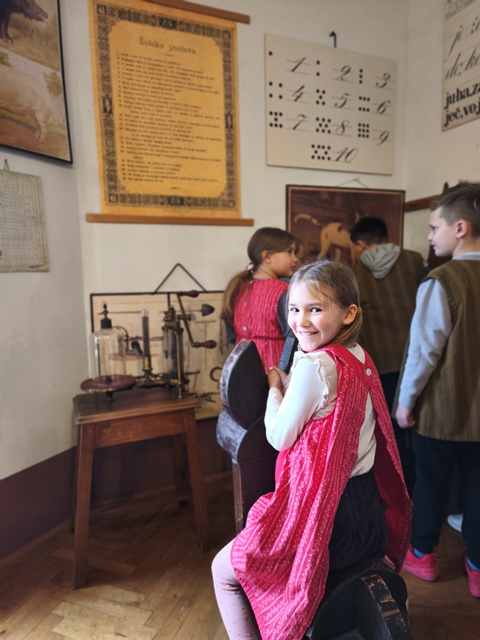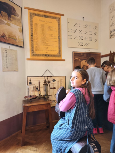 Najzanimivejši del obiska je bila učna ura iz leta 1865, kjer smo za trenutek stopili v čas starih šolskih pravil, lesenih klopi in tablic, na katere smo pisali s kredami. Bilo je zelo zanimivo in poučno. Domov smo se vrnili polni vtisov in novih znanj o šoli nekoč in danes.